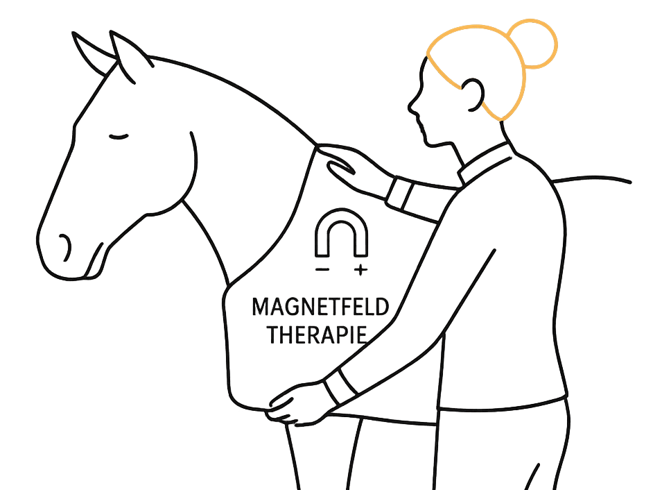 Magnetfeldtherapie (Decke, Halsteil und Gamaschen) wird in der Pferdereha unterstützend eingesetzt, um Durchblutung und Zellstoffwechsel zu fördern. Sie ist schmerzfrei, gut verträglich und kann bei Muskel- und Sehnenproblemen sowie in Regenerationsphasen sinnvoll begleiten. Auch im Bereich von Lunge und Atmung kann sie durch entspannende Effekte auf die Atemmuskulatur und eine verbesserte Gewebedurchblutung unterstützend wirken.